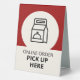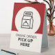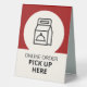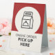 This is a red "Online Order Pickup Here" table tent sign with an food icon (can be replaced) and text in black. It is used to indicate where customers can pick up their online orders. Clear message and easy to spot. A great order pickup sign for restaurants, shops, and other small businesses.