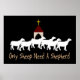 A row of sheep march obediently in a line with a church in the background and the words "Only sheep need a shepherd." Great way for freethinkers to show they are not sheeple marching blindly to someone else's dogma.