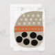 A fun, whimsical and totally cute abstract graphic in neutral colours with pops of orange and turquoise along with big black circles. The main images is a beige shape with lighter squares in 3 rows, then an orange band with aqua dots, large circles below. All on a textured white background.
