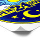 Retro design with half of a circle displaying a sun design and the bottom a moon design. In the centre is "Open 24 Hours". Colours are blue and yellow