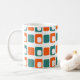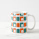 This mug has a mid-century modern design of repeating orange rectangles with white rectangles inside alternating with teal rectangles.