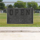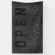 Customise this unique and eye-catching black faux vegan leather Open Business banner featuring business name and hours of operation. Design created with 3 layers of bold typography in different shades to simulate the embossed look.