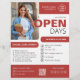 Invite future students and families to explore your campus with this professionally designed Open Day flyer. Perfect for colleges, universities, or educational institutions, this template highlights key event details like date, time, location, and featured activities—such as campus tours, info sessions, and meet-and-greets with faculty. With bold headings, modern icons, and a clear call to action, it’s an ideal way to promote your admissions event, both online and in print. Easily customisable to fit your school's branding and event schedule.