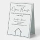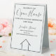 This sleek black and white Open House table tent sign is custom made with your realty company name and realtor contact details. Impress new home buying clients with this chic, simple signage with this classy typography sign. A modern, minimalist line drawing of a house sits under the real estate agent information.