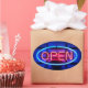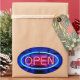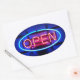 Oval sticker with an image of a blue and red neon “open” sign on black. The back is black with customisable text. See the entire Tubular 80s Sticker collection in the INVITES | Stickers & Labels section.