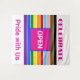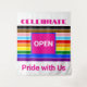Signal that you're open and welcoming to people who might need to see it. Fly it for a month, fly it year-round. As shown with a template with the word "Open", but you can change that to any text you like. Change the background colour or the rectangle box colour. Design description: This is vertical design space filled with horizontal stripes. Horizontal black, brown, light blue, and light pink, an homage to the Progress Flag, with horizontal red, orange, yellow, green, blue, and purple stripes as an homage to the original Pride Flag. The stripes have space between them so that the background shows through. As shown, the background is white. As shown, the inside of the rectangle is a hot pink to pay tribute to gay liberation movements of the past, and the border of the rectangle is the same blue as the blue stripe of the flag. The word "Open" inside the rectangle is in white font and is a template. Fully customisable. Note: the design is centred in the middle. The stripes go from edge-to-edge horizontally, but not vertically, there is empty space above and below the design. In that empty space at the top is a template with the word "Celebrate" in the same hot pink as the rectangle, in a bit of a retro 1970s font. At the bottom is another text template, with the words, "Pride with Us" in the same hot pink but a sans serif font. You can change the template words or erase them and leave that space, and further customise the templates by changing fonts, colours, etc. The rectangle with the word "Open" is approximately centred and covers part of the light pink, light blue, red, orange, yellow, blue and green stripes. As shown, on the standard white background.