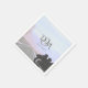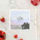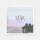 A motorcycle with two helmets sits against a dusky sunset background on this biker couple wedding reception napkin. It can be easily customised to suit your own needs.