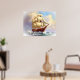 A majestic sailing ship with billowing white sails navigates through a lively sea under a sky dotted with fluffy clouds. The vessel's detailed structure contrasts beautifully with the vibrant blue of the ocean and sky.