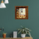 A rustic window with wood windchimes hanging looking out a desert canyon scene.