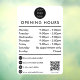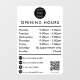 A white opening business hours window decal and window cling featuring business logo, QR Code, your custom social media icons and contact details. A personalised shop hours window cling perfect for shop windows and front door signs. Perfect for a business shop owner who would like to notify their customers about its opening hours.