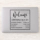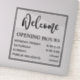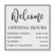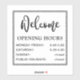 Square, opening hours window cling featuring the text "welcome" in an elegant calligraphy script font and your opening hours. Black text on a transparent background.