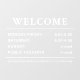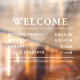 Opening hours window cling featuring white or custom colour text "Welcome" and your opening hours on a transparent background. Colours and fonts can be changed with the design tool.
