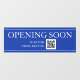 OPENING SOON Sign with QR code for store entry door or window in white text on deep blue background with QR code message.