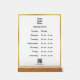This acrylic business sign has a template you can edit to show your hours of operation. A display image, which you can replace with your business logo, is at the top. A QR code is near the bottom. (Remember to enter your website for the QR code to work correctly.) All text can be edited or deleted. The sign has an elegant faux (not foil) gold border.