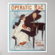 Vintage music sheet cover for the song, "Operatic Rag", showing a woman in white dress and large black & white hat playing a grand piano.