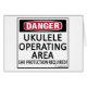 Danger, Ukulele Operating Area! Ear Protection Required! This is fair warning to anyone around musical instruments. See all our musical designs on on cups, mugs, tee shirts, sweatshirts, hats, and other gifts and clothing.