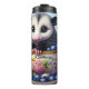 This whimsical illustration features a cute opossum nestled inside a large, ornate teacup filled with juicy blueberries. The teacup sits on a saucer amidst scattered blueberries on a chequered tablecloth. A decorated teapot and sugar bowl are nearby, all surrounded by lush purple flowers and buzzing bees, suggesting a delightful, fantastical tea party in a garden setting.