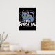 This cheerful graphic features a cute, blue cartoon cat with subtle yellow and pink highlights, gazing forward with bright yellow eyes and a content expression. Swirling, colourful lines in pink, yellow, and orange frame the feline. The bold white text at the bottom delivers an uplifting message: "STAY PAWSITIVE," playing on words with a paw print integrated into the 'A'. The design is set against a solid black background. Digital download for personal use only.