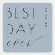 This wedding sticker features a minimalist design with a light blue background, showcasing the phrase "BEST DAY ever" in bold, uppercase letters paired with elegant cursive script. The layout is clean and modern, utilising generous spacing to highlight each word while maintaining balance. With its contemporary style and celebratory mood, this sticker is perfect for marking special moments on your big day.