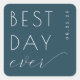 This wedding sticker features a minimalist and modern design with a dark teal background, creating a striking contrast with the white text. The phrase "BEST DAY ever" is prominently displayed in a mix of bold sans-serif and elegant script fonts, conveying a celebratory and optimistic mood. Customisable date options are available on the side, allowing for personalisation while maintaining a clean and uncluttered layout. Perfect for commemorating your special day, this sticker combines sophistication with simplicity, making it ideal for any joyous occasion.