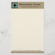© Sunny Mars Designs. Stationery writing paper for an optometrist or eye care specialist business with a brown textured strip on the top and the bottom and the iris of a striking blue eye behind a window with a black frame.