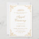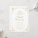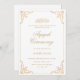 A religious Islamic Aqiqah ceremony invitation card in celebration of the birth of the newborn baby boy. This vintage style announcement has a formal white colour with an elegant gold script typography written on the front. There is an opulent baroque acanthus leaf ornament in golden in the corner of the border frame to give a luxury feel to the design. The blessed mother and father can send this antique printable invite to their friends. Customise the rsvp details and the rest of the information about the event. Aqeeqah. Classic. Qurbani.