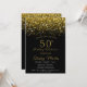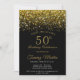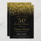 This is a black and gold-themed invitation for a 50th birthday celebration. It features a sparkling gold confetti design at the top, opulent gold text, and personalised details. The event date, time, and venue are listed, with RSVP instructions at the bottom. The invitation gives a formal yet festive impression. Customisation available!