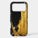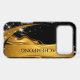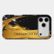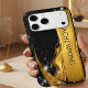 Protect and elevate your device with the Opulent Swirl Liquid Gold Black iPhone 17 Case. This striking, dynamic design captures the awe of the cosmos with a bold, modern twist. Dramatic black space serves as the backdrop for brilliant white starbursts and a central, gilded banner featuring the "ACHEMPONG" name in stark relief. Smooth, reflective streams of liquid gold flow across the frame, creating a sense of dynamic movement and celestial energy. This premium Achempong Zazzle case offers durable protection and showcases luxury abstract art as sophisticated mobile technology accessory, perfect for making a high-end statement.
