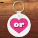 This keychain features a vibrant hot pink heart containing the bold, white, rounded lower case letters or, a playful abbreviation for Oregon, the beaver state.