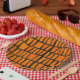 A cool and funky orange and black african tribal pattern. Orange oddly shaped rectangles and squares with a pottery texture on a black background. Could also be seen as an old bookcase pattern.