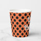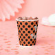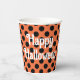 This paper cups with an orange and black polka dot design has a Happy Halloween message for your party guests.