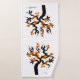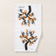Orange and black love birds sakura cherry tree with blossoms bath towel set. It features a black sakura tree with orange flowers with black hearts in the centre and a pair of love birds. Your name is written in a script style font.