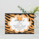 This birthday party invitation features an orange and black tiger print and black and white polka dots.
