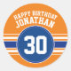 Orange and Blue - This masculine design includes jersey stripes and team colours. The lean, modern look is perfect for any athlete celebrating a birthday. The general sports theme can be used for any lover of hockey, football, soccer or baseball. You change the numbers to your a special age for a birthday celebration.