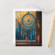 AI art depicting a dream catcher in an orange and blue feathers in window looking out at trees.