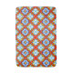 Beautiful, vibrant, abstract geometric tile design in orange, blue and yellow over a white background. Its retro, bright colours and fanciful shapes are perfect for your kitchen and home décor.