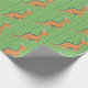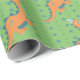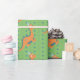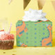 Cute cartoon orange dinosaur wearing birthday party hat in green stripe background.