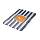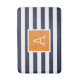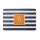 Custom monogrammed bath mat with a preppy stripe pattern in navy blue, orange and white colours. Personalise it with your monogram initial in a square frame. Use the design tools to choose any background colours, edit the text fonts and colours and add your own photos to create a one of a kind design to match any bathroom decor.