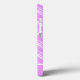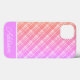 This iPhone case features an orange and purple gradient plaid pattern with a thick purple stripe and thin white stripe with a customisable name.