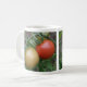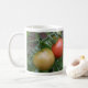 This beautiful mug features a photograph of an orange and a red cherry tomato growing on a tomato plant in a suburban garden. The photograph was taken using macro photography for a detailed result. The design is shown on a basic white mug, but is also available on several other styles and colours of mugs.
