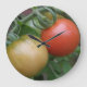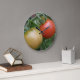 This awesome clock features a photograph of an orange and a red cherry tomato growing on a tomato plant in a suburban garden. The photograph was taken using macro photography for a detailed result.