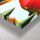Canvas print with flowers consisting of orange and red tulips seen from a low point of view against a blue sky.
