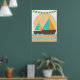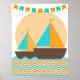 A nautical sailboat design nursery poster great for baby's room or an older child's room features a sailboat with teal blue and orange sails, a chevron stripe ocean of teal and orange, and teal and orange flag banner.
