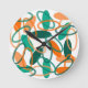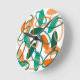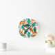 This clock has a mid-century modern design of ovals and oval outlines in orange and teal.