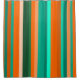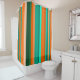 This shower curtain has vertical orange and teal stripes in different shades and thicknesses running down the curtain.