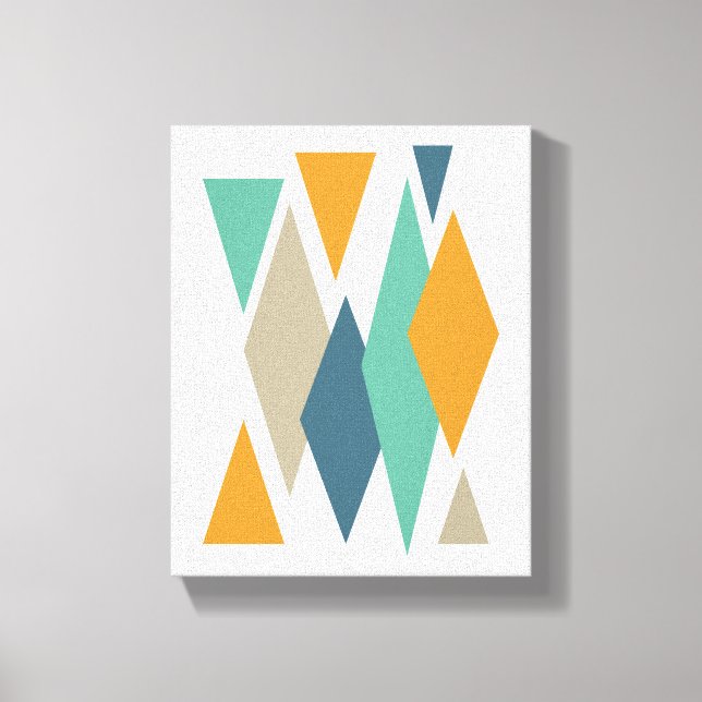 This mid century modern wrapped canvas features diamonds and triangles in the fun colours of turquoise blue and orange . Your home deserves to add this unique pop of colour to it's walls.