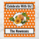 Custom wine bottle labels for Thanksgiving. Orange and white polka dot background with a beautiful sunflower and pumpkin image spilling out of a large white circle. You can change the message from "Celebrate With Us" to anything you choose. And, of course, you can customise the name at the bottom from "The Newsmans" to any other person or persons - like From Your Bestie, From Mum, etc.