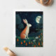 An orange and white rabbit sits in a bed of carrot shaped flowers in the moonlight.