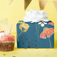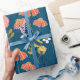 Bright orange and yellow doodle flower pattern on blue background.