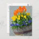 Orange and yellow spring tulips in barrel planter postcard